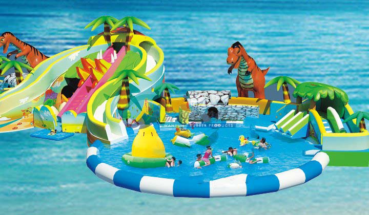 侏羅紀公園主題滑梯以恐龍在林中嬉戲為主題,左右兩側連接2個圓形充氣水池,中間連接一個方形水池,給游客提供了大面積的戲水空間,各個水池之間均有滑梯連接,多個不同的滑梯通道增加了設備的趣味性,該產品配備多個不同高度的滑梯,滿足了不同游玩人群的需求。恐龍造型異常逼真,讓游玩的人們有種身臨其境的感覺。